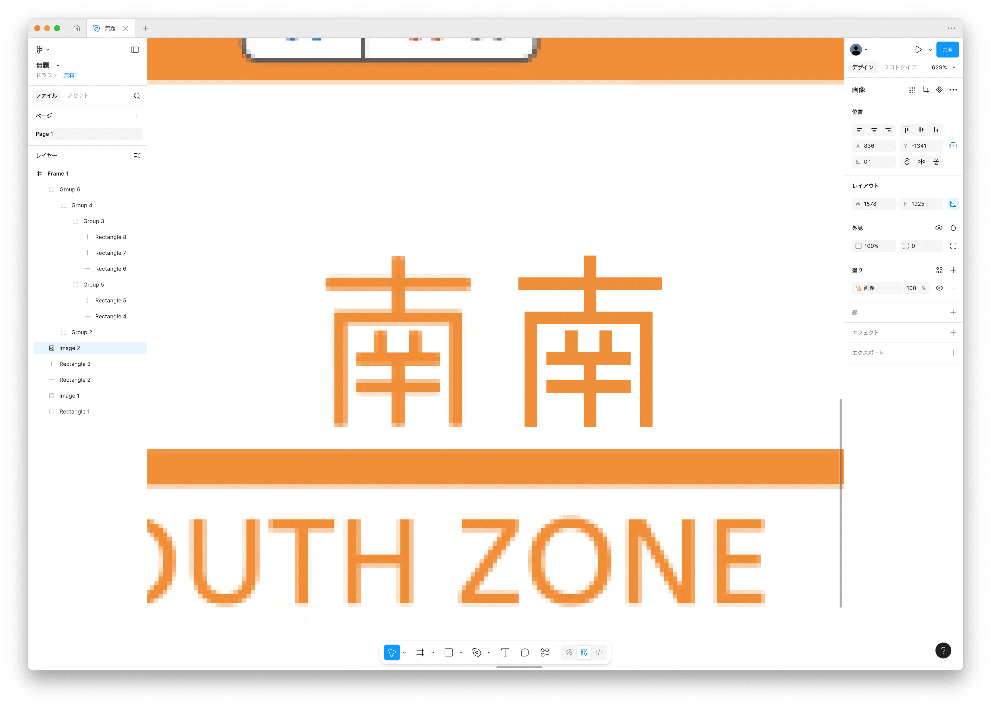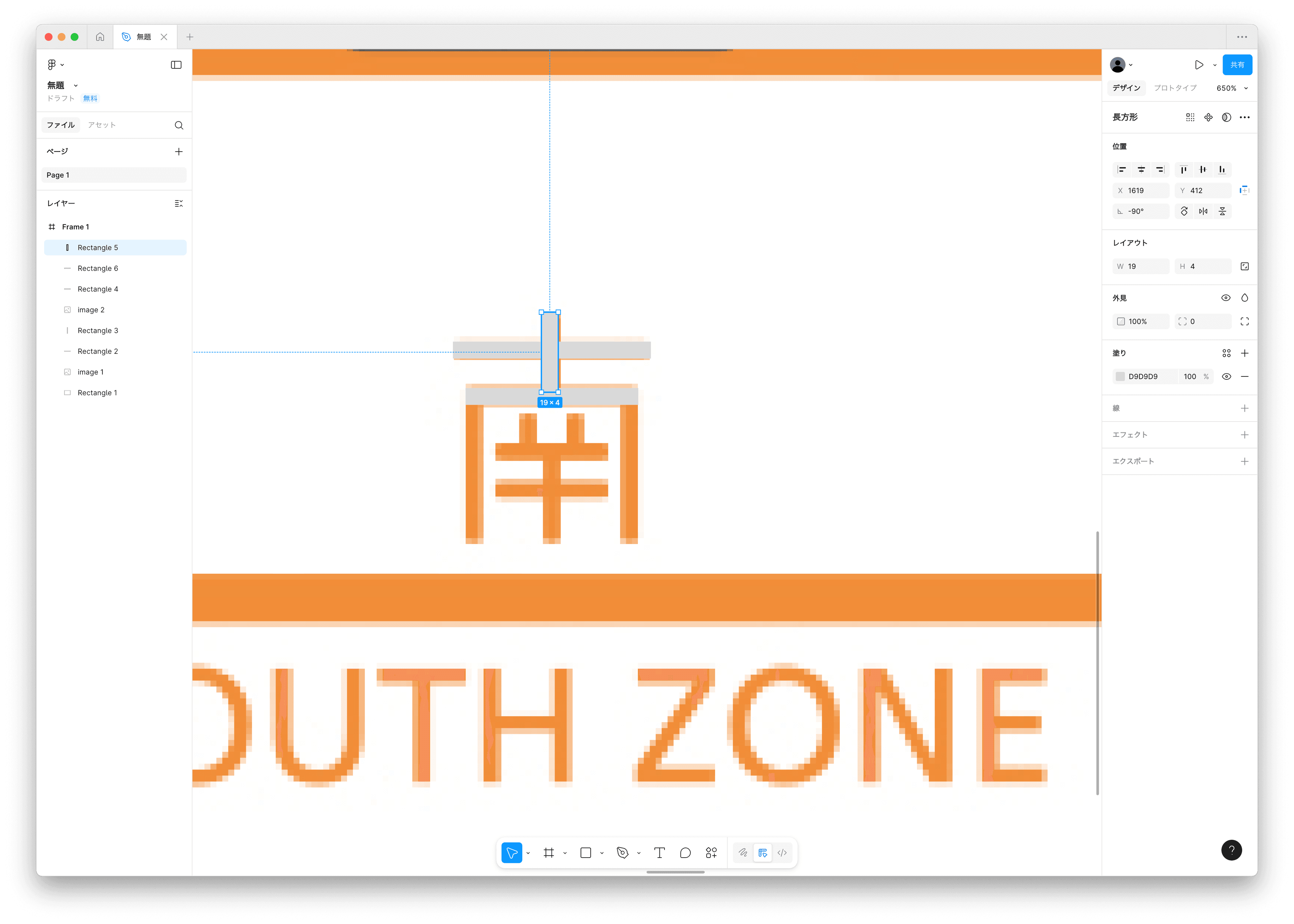 最初の難問が南ゾーンの「南」の漢字です。見たことがある方はわかると思いますが、南・中央・北などのゾーン名はカクカクした特殊なフォントで書かれていて、世の中にはおそらくは出回っていない独自フォントだと思われます。当然、そんなものは持っていないので、画像をトレースして再現していきます。
