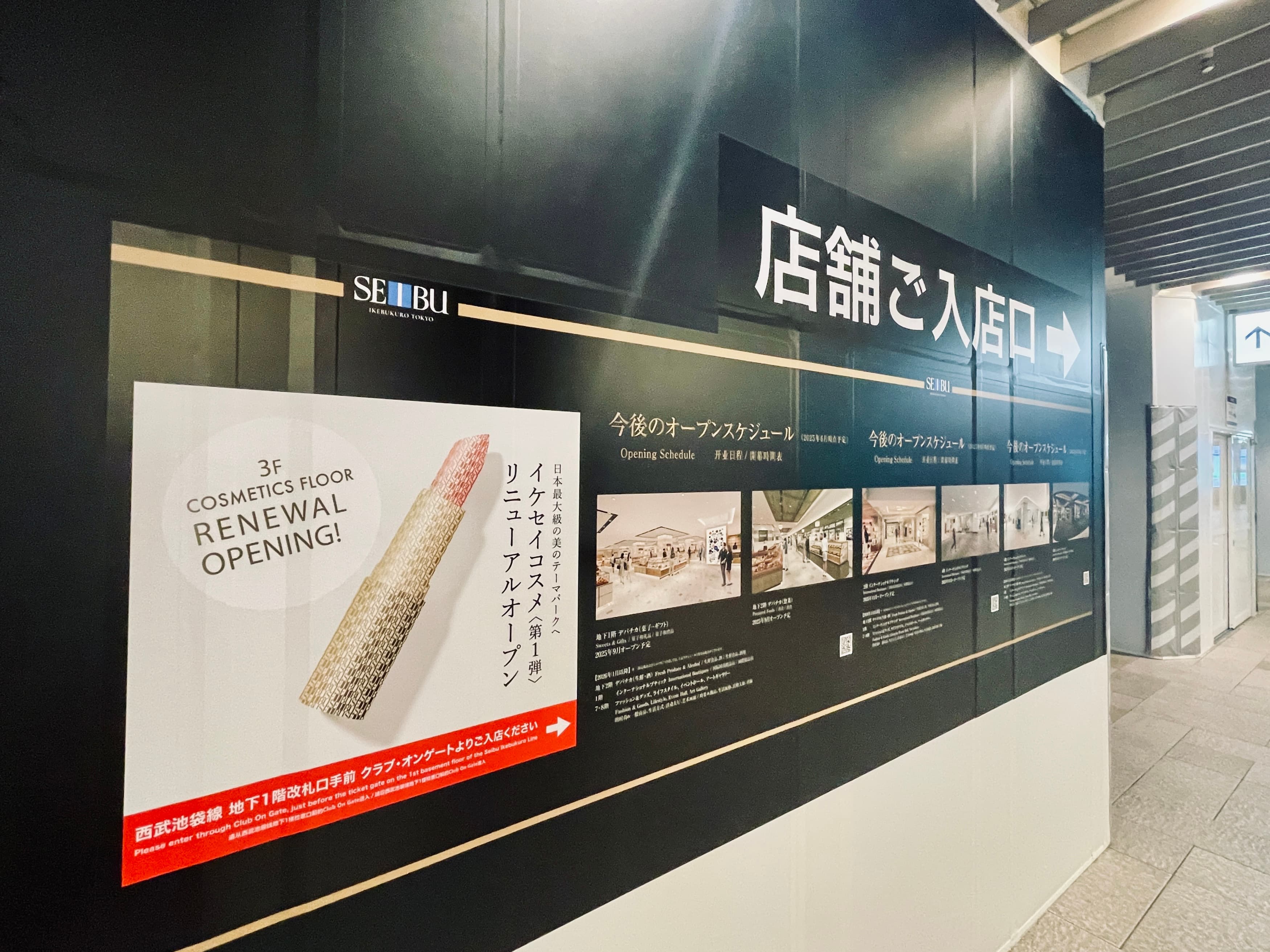 新たに開業したコスメティックスフロアのフロアマップは、これまでのデザインが一新され、黒をベースにし、ゾーンわけも廃止されていました。もっとも西武池袋本店はご存知の通り、概ねこれまでの南ゾーン部分のみが売り場となったことで、店内での『ゾーン』の概念も不要になったのがデザイン変更の根底にあるのはいうまでもないでしょう。