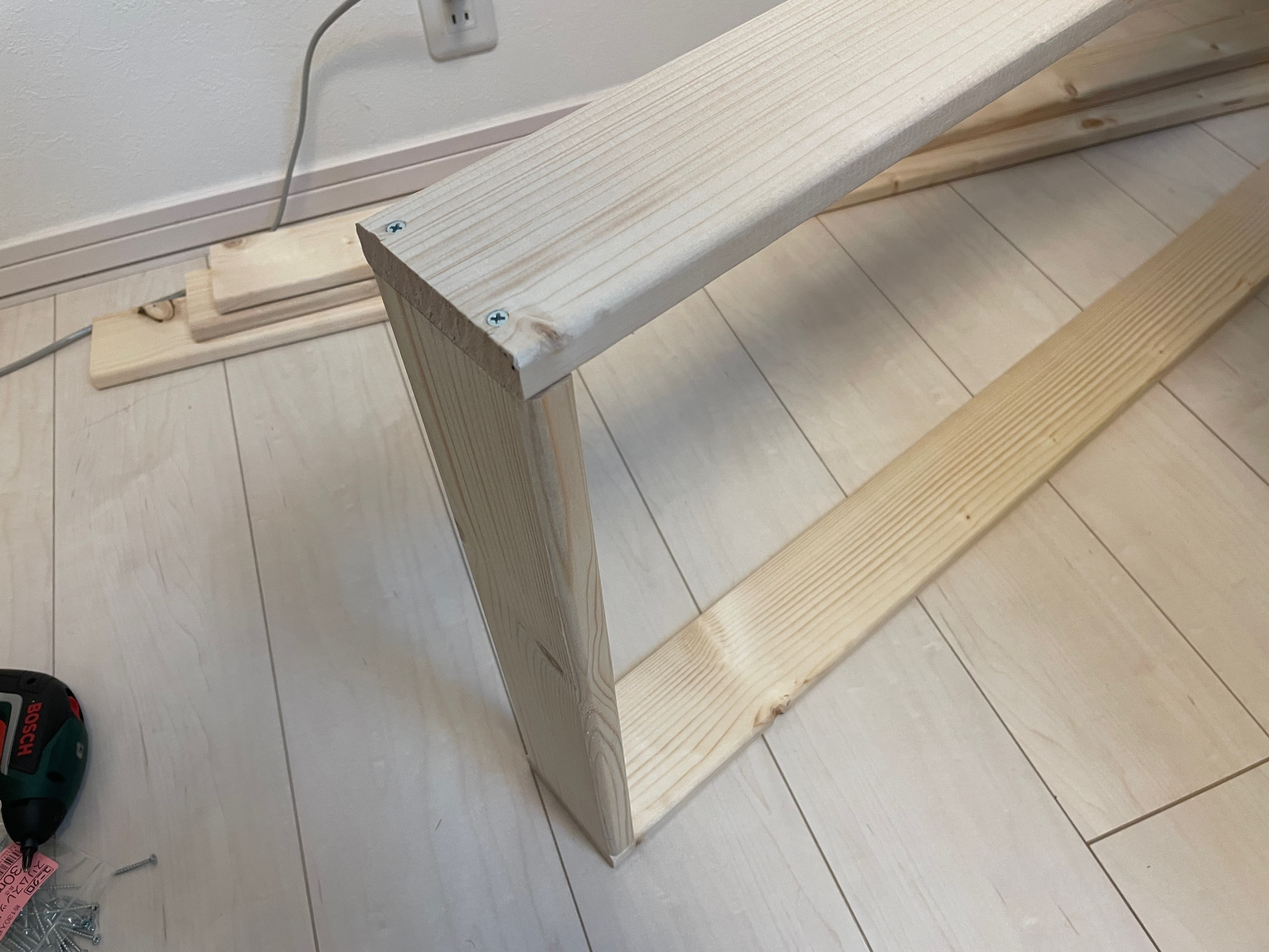 今回はコストカットのため、1*4材で大枠を2つ作り、中の棚板の1*6材で2つを連結して1つの棚にします。まずは枠を2つ組み立てます。