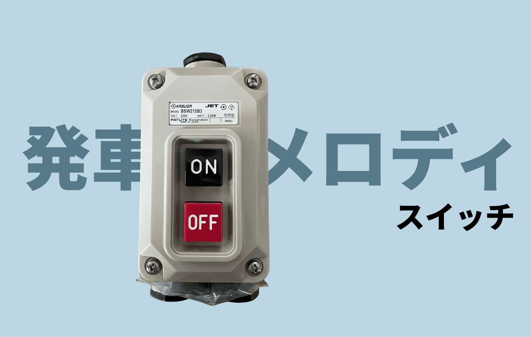 JR線などで車掌さんが操作する発車メロディスイッチですね。このスイッチ自体は春日電機の動力用開閉器という汎用スイッチで、工作機械のON/OFFスイッチなどにも用いられているものだそうで、ホームセンターやAmazonなどで購入できます。