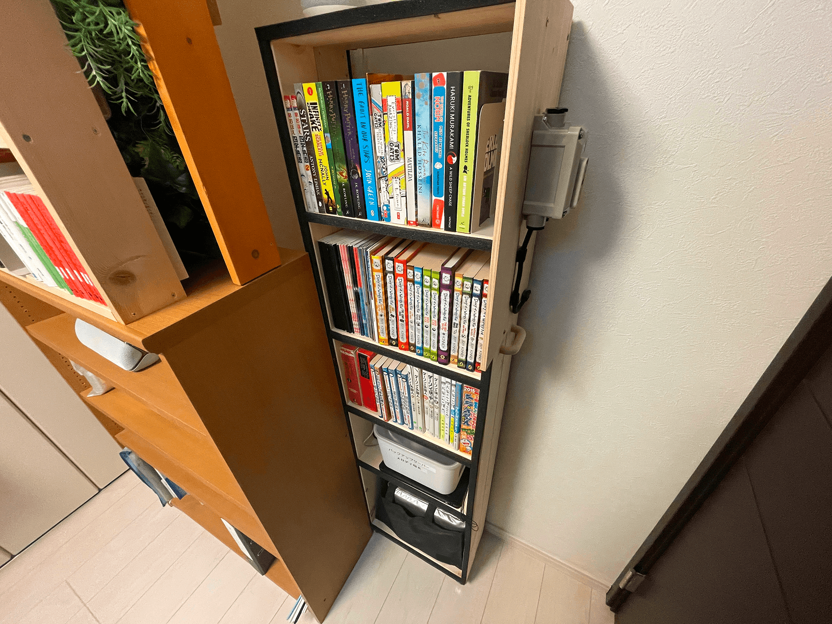 部屋を見渡しましたが、発車メロディスイッチを釘付けしていいような場所はありませんでした。どうしようか考えたのですが、ちょうど本棚が足りないなとこの頃思っていたので、本棚を拡張して、その本棚にスイッチを取り付ければいいのかなという結論に至りました。
