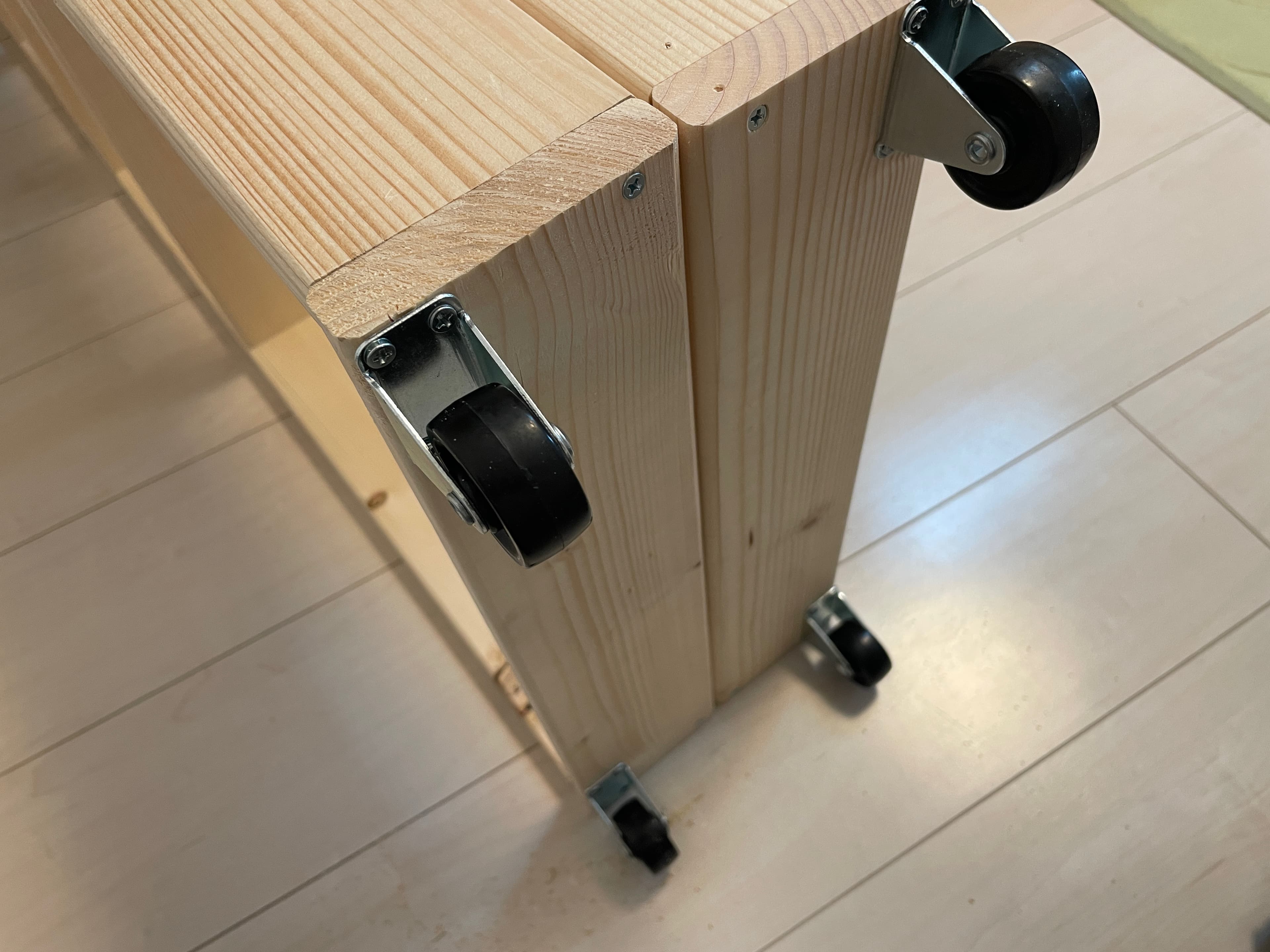 冒頭で言いましたが、この棚は既存の本棚の後ろに設置し、中身を取り出すときに引き出す想定です。そのために、横方向に固定のキャスターをつけたわけですが、引き出しやすいように取手もつけておきましょう。