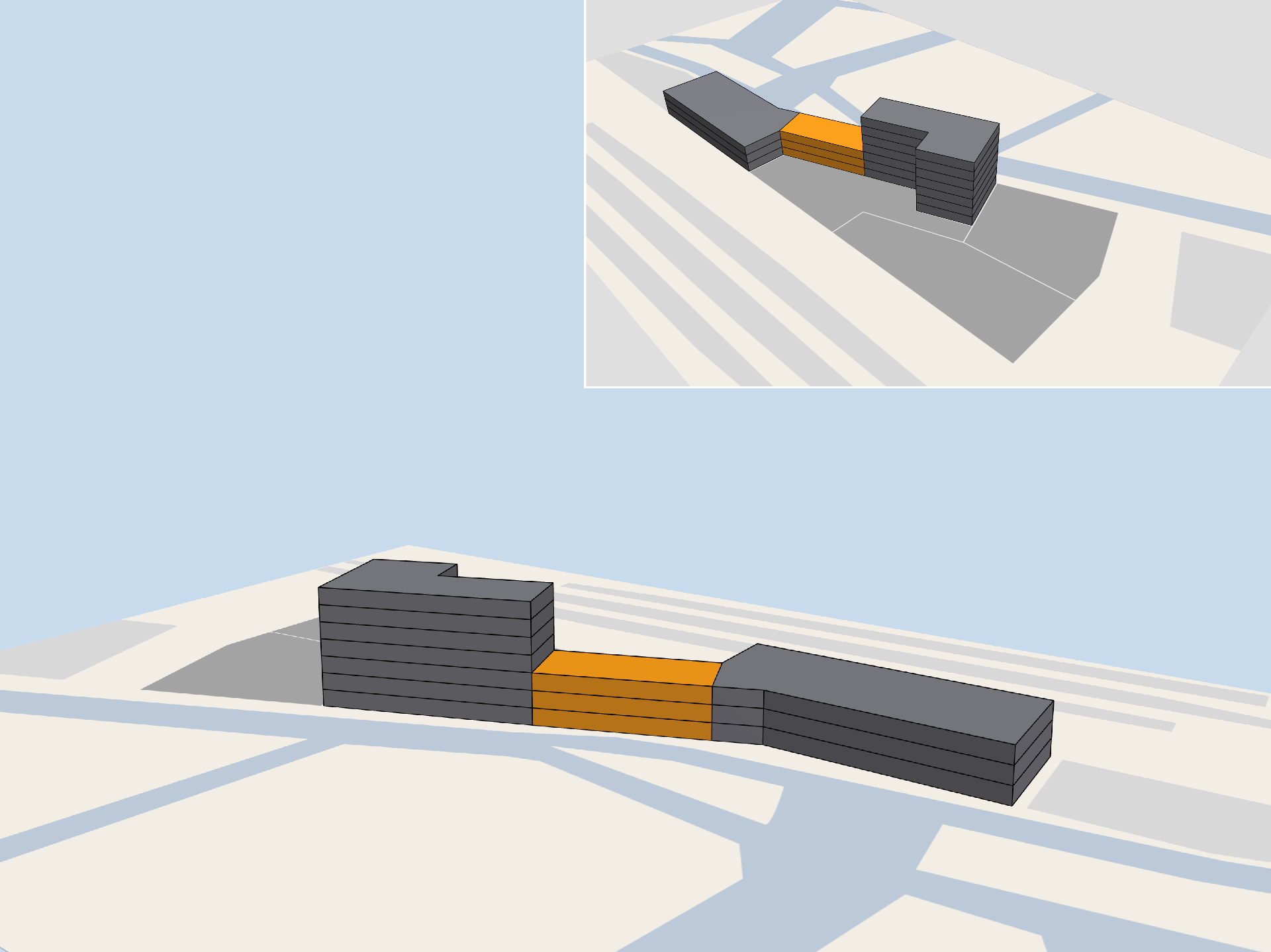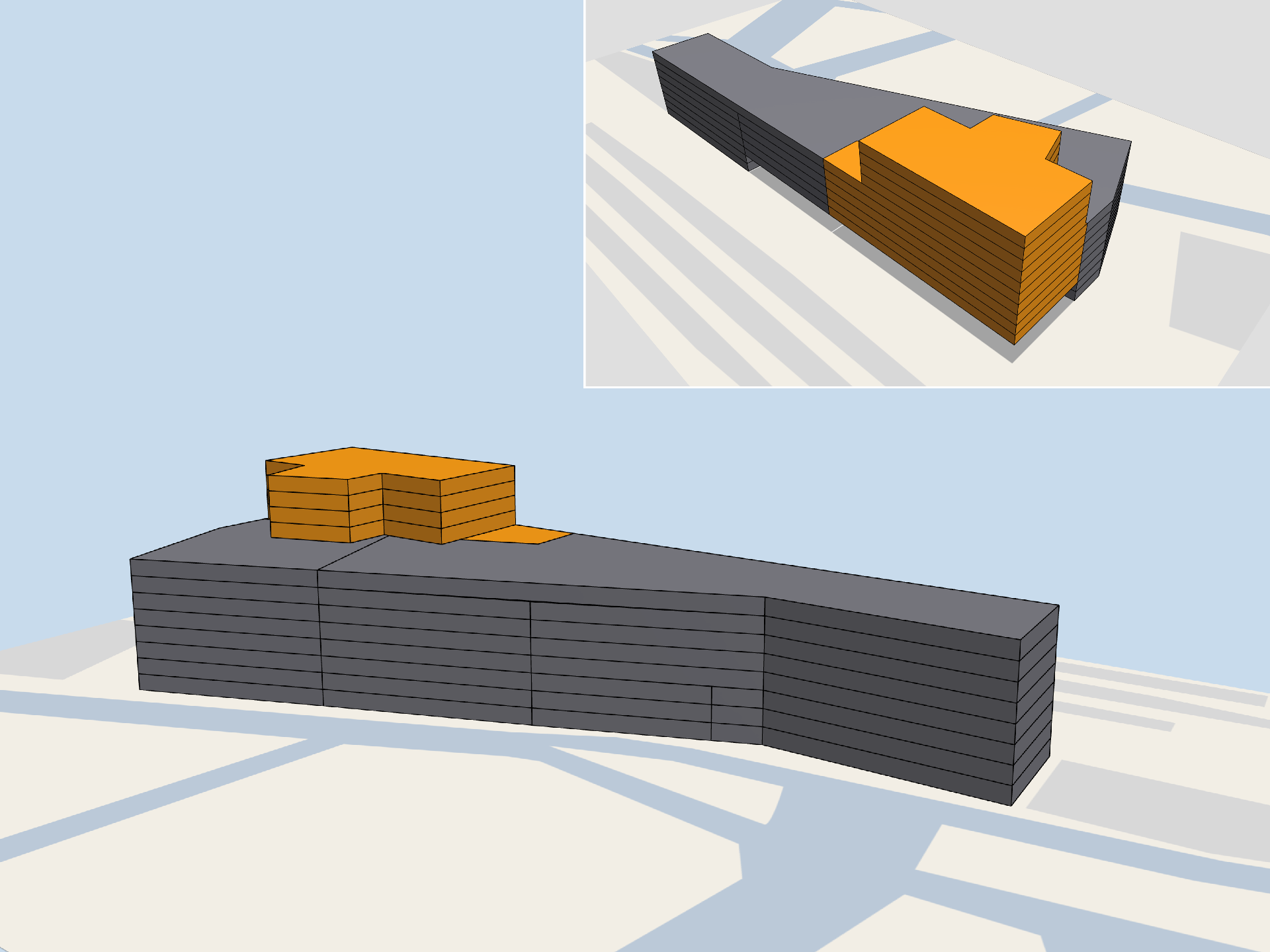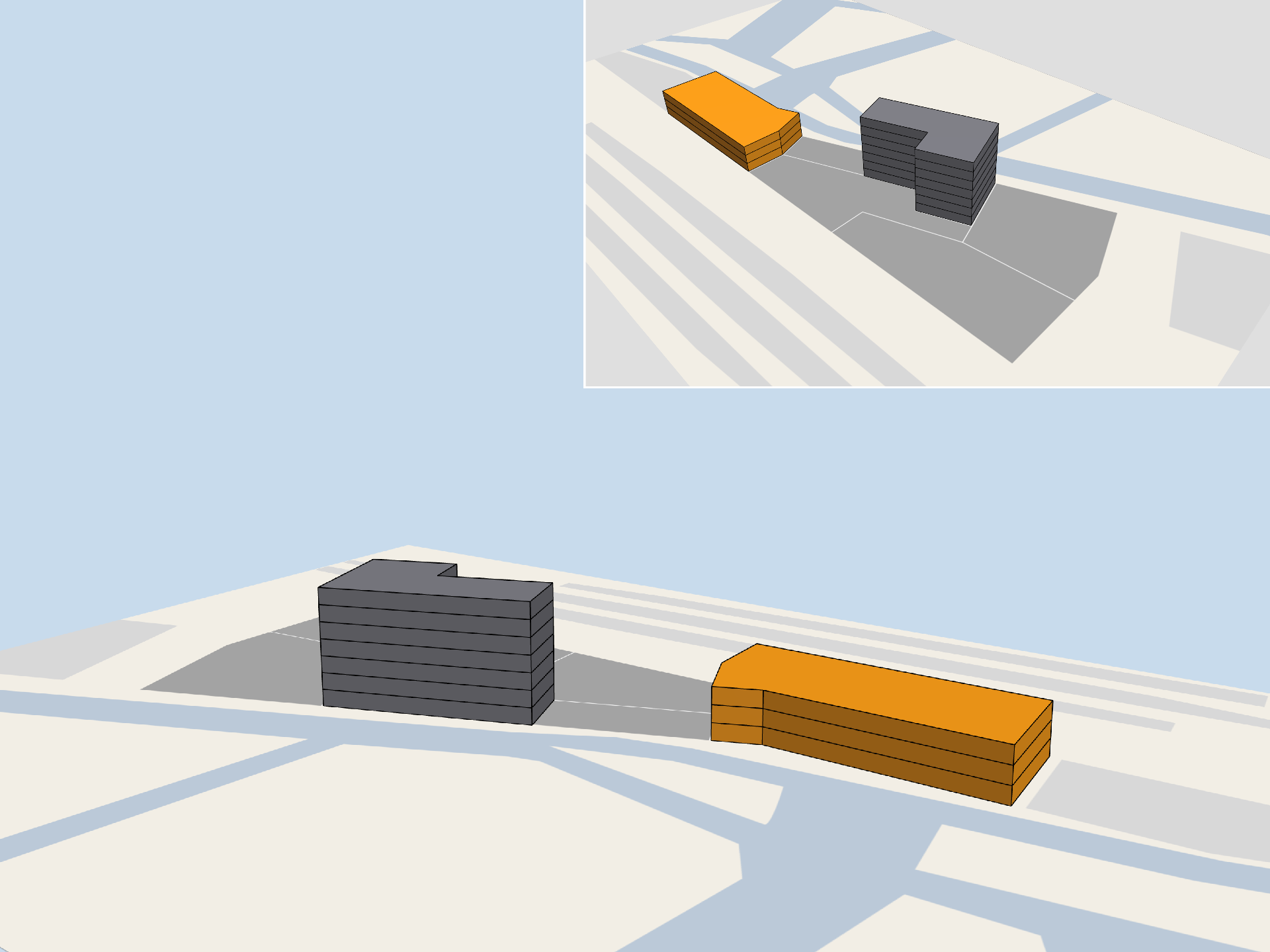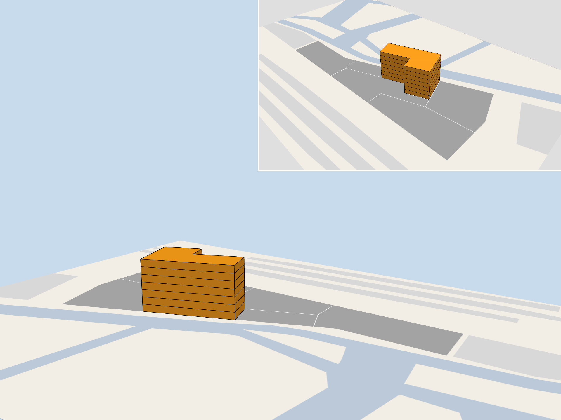 これらについて、建築・増築された部分をCADを使って視覚化してみよう。視点は東北の方向から見たものであり、右上の小窓は池袋駅側に視点を置いたものである。地面の地図はあくまでも現在との比較の意味で、現在の道路や周辺施設を表しているが、当然1950年代には道路状況や周辺建物は今とは違っただろう。