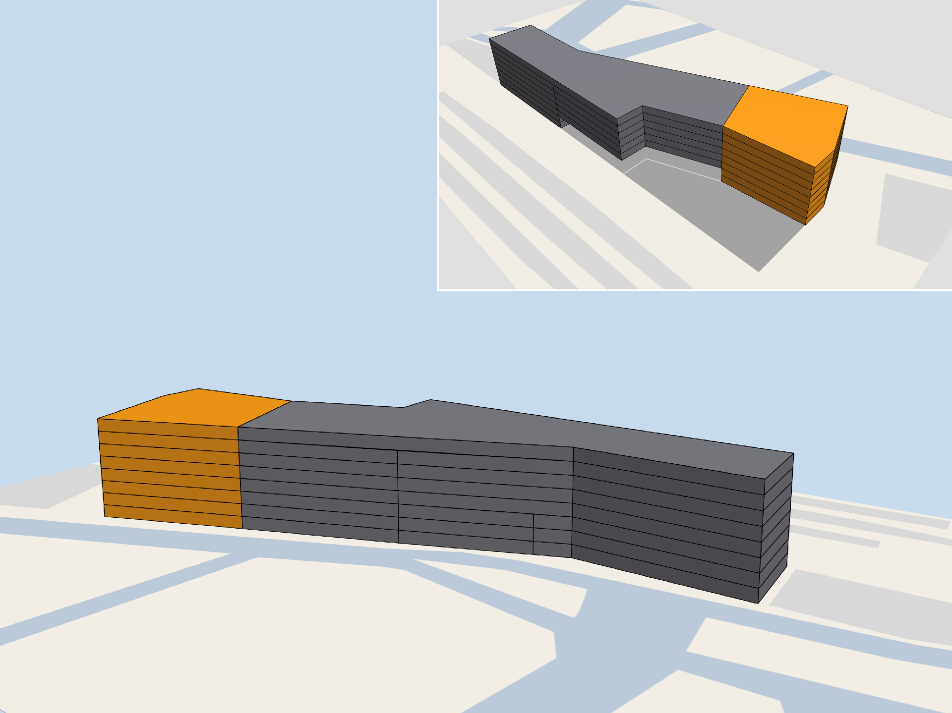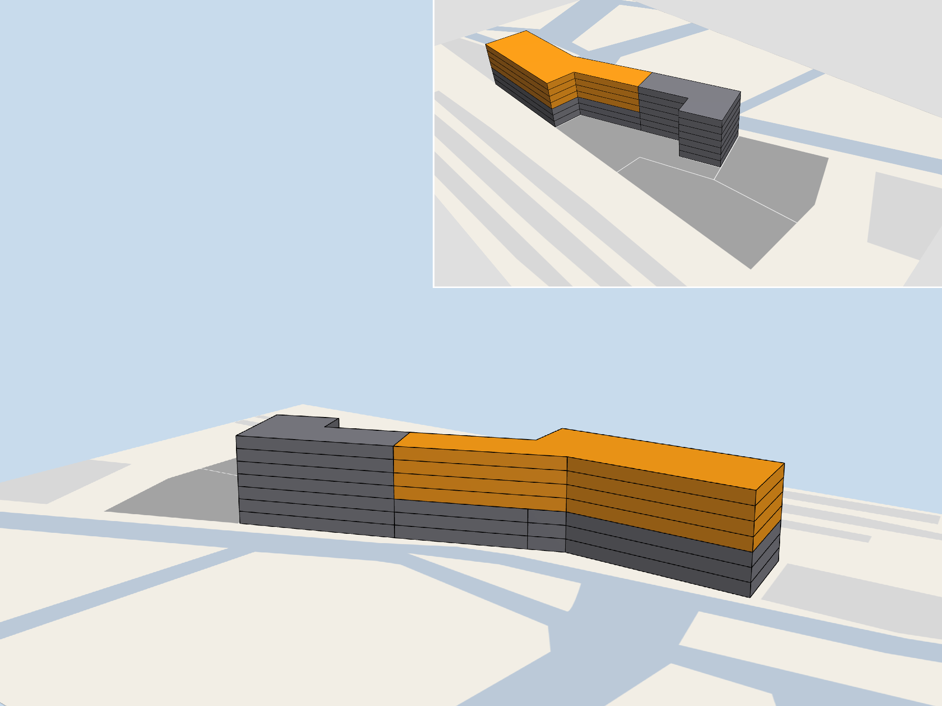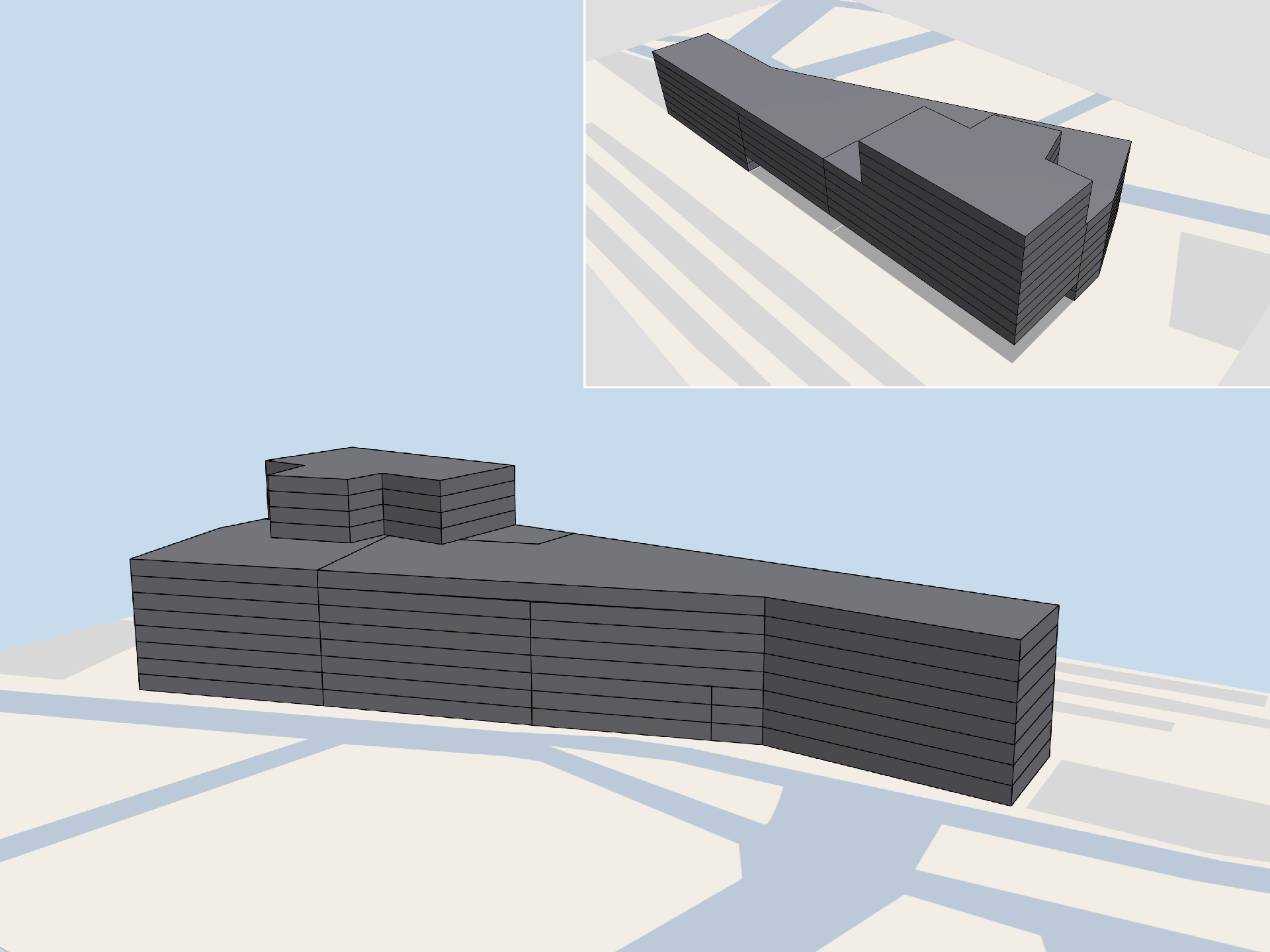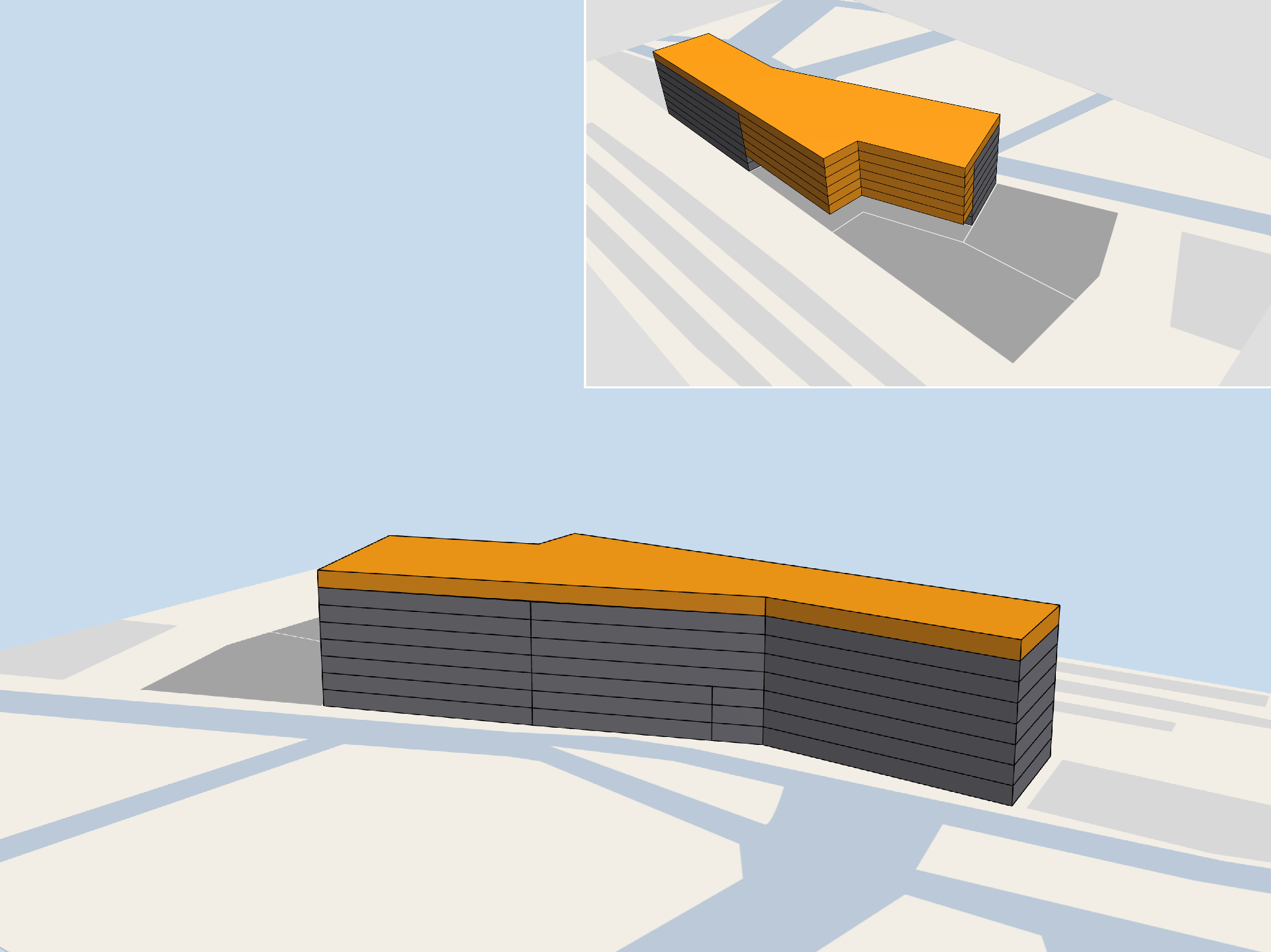 これらについて、建築・増築された部分をCADを使って視覚化してみよう。視点は東北の方向から見たものであり、右上の小窓は池袋駅側に視点を置いたものである。地面の地図はあくまでも現在との比較の意味で、現在の道路や周辺施設を表しているが、当然1950年代には道路状況や周辺建物は今とは違っただろう。