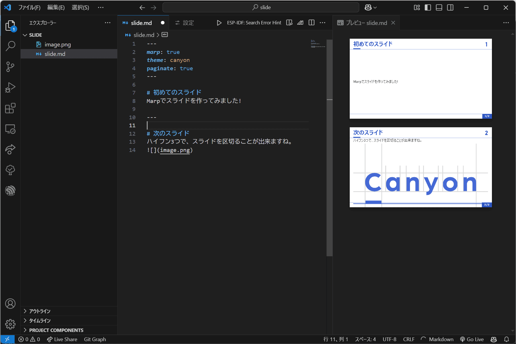 ここまで、Marpの使い方と、Marpで使用できるスライドテンプレートであるCanyon(キャニオン)を紹介しました。