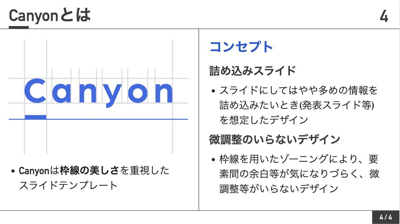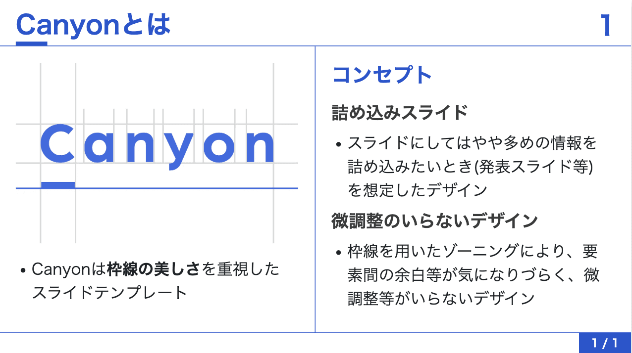 - Canyonは**枠線の美しさ**を重視したスライドテンプレート