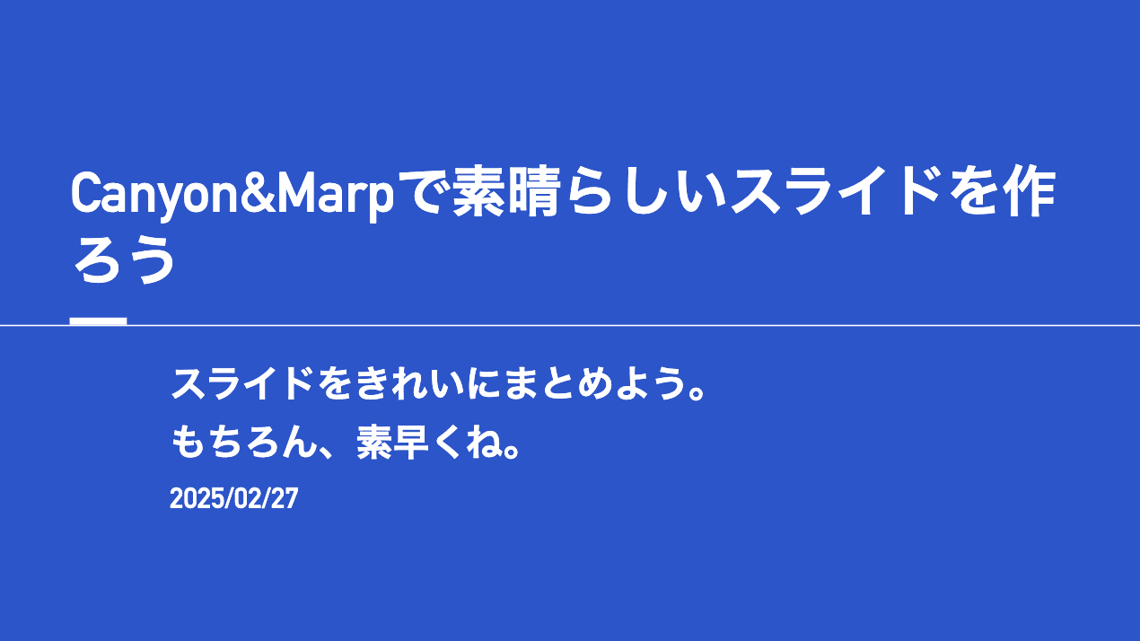 タイトルスライドなどはコンテンツスライドとは異なり、タイトルが中央に大きく表示された印象的なスライドであることがほとんどです。Canyonでもこれに対応しています。タイトルスライドを使用する時には、スライド冒頭に<!--_class: title-->を追加します。