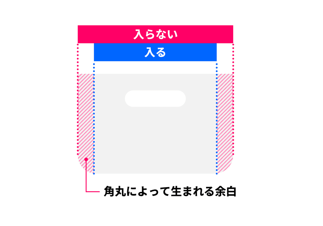 この図でわかる通り、やわらかポリエチレンケースは角を丸めたことによって、底面積が減少しており、角が丸まっていなかったら入っていたであろう物体(すなわち横幅がやわらかポリエチレンケースの横幅と一致してるもの)は下まで収納することができず、最大幅は横幅から両端に半径分の余白をとった長さになるということです。