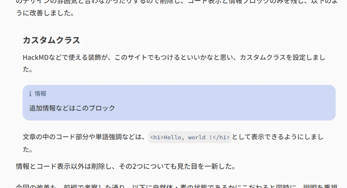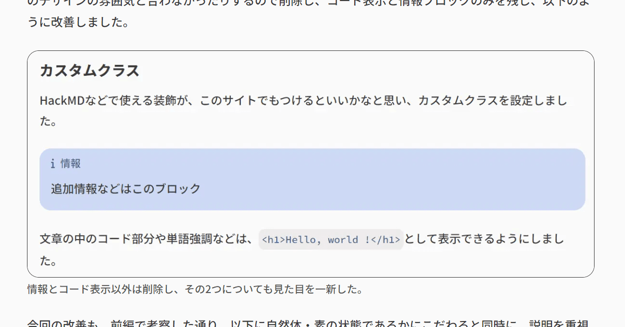 その他の強調表示、時刻表示などについても、前述のリンクのように行間や改行位置を乱したり、全体のデザインの雰囲気と合わなかったりするので削除し、コード表示と情報ブロックのみを残し、それらも以下のように改善しました。