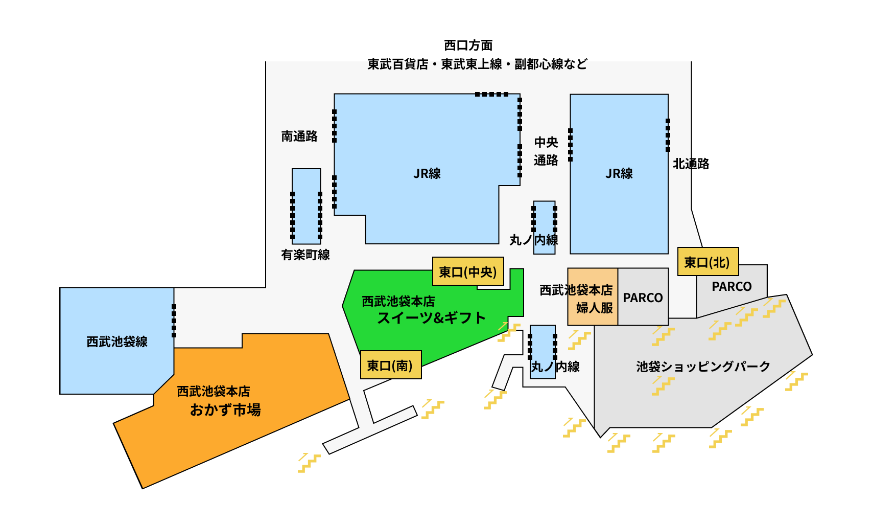 このことに留意して再び地下1Fのフロアマップを見ると、池袋西武のテリトリーは南ゾーンだけだと考える方が自然です。つまり、こういうことです。