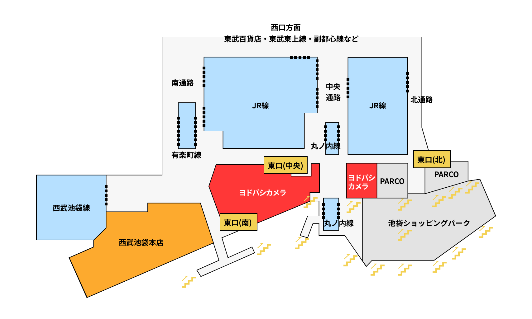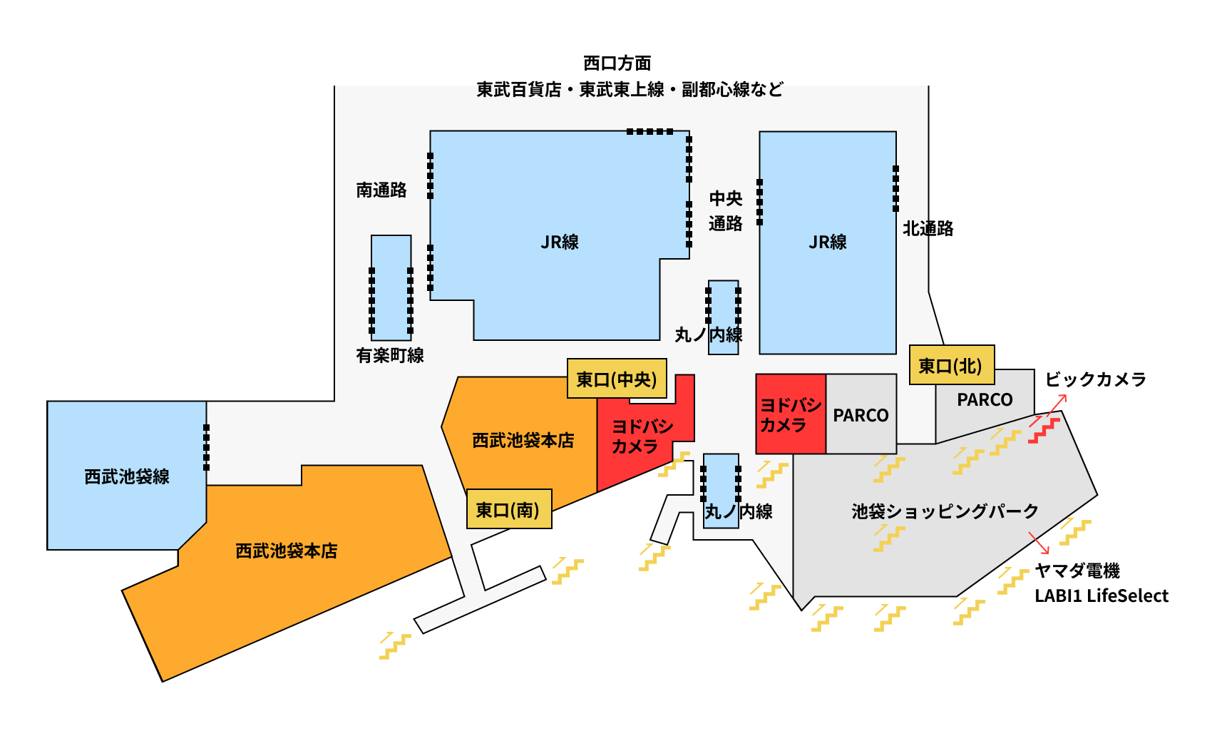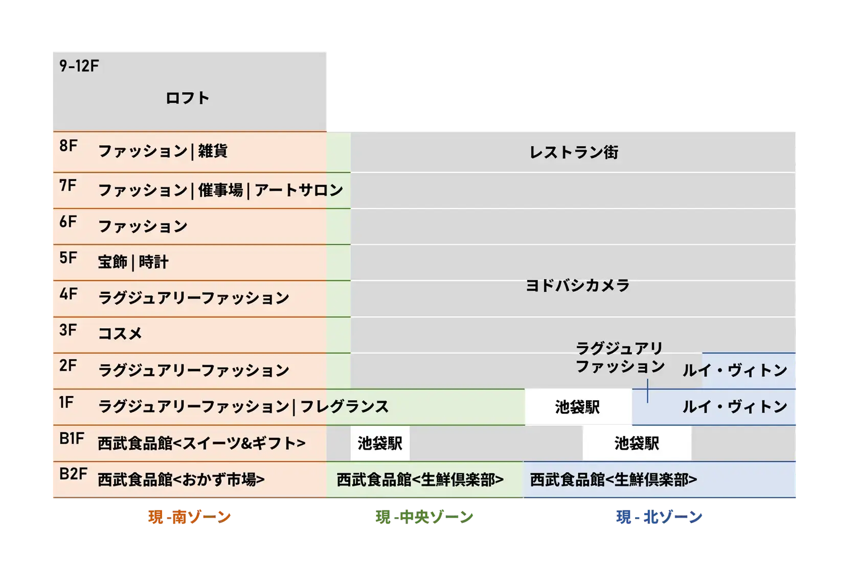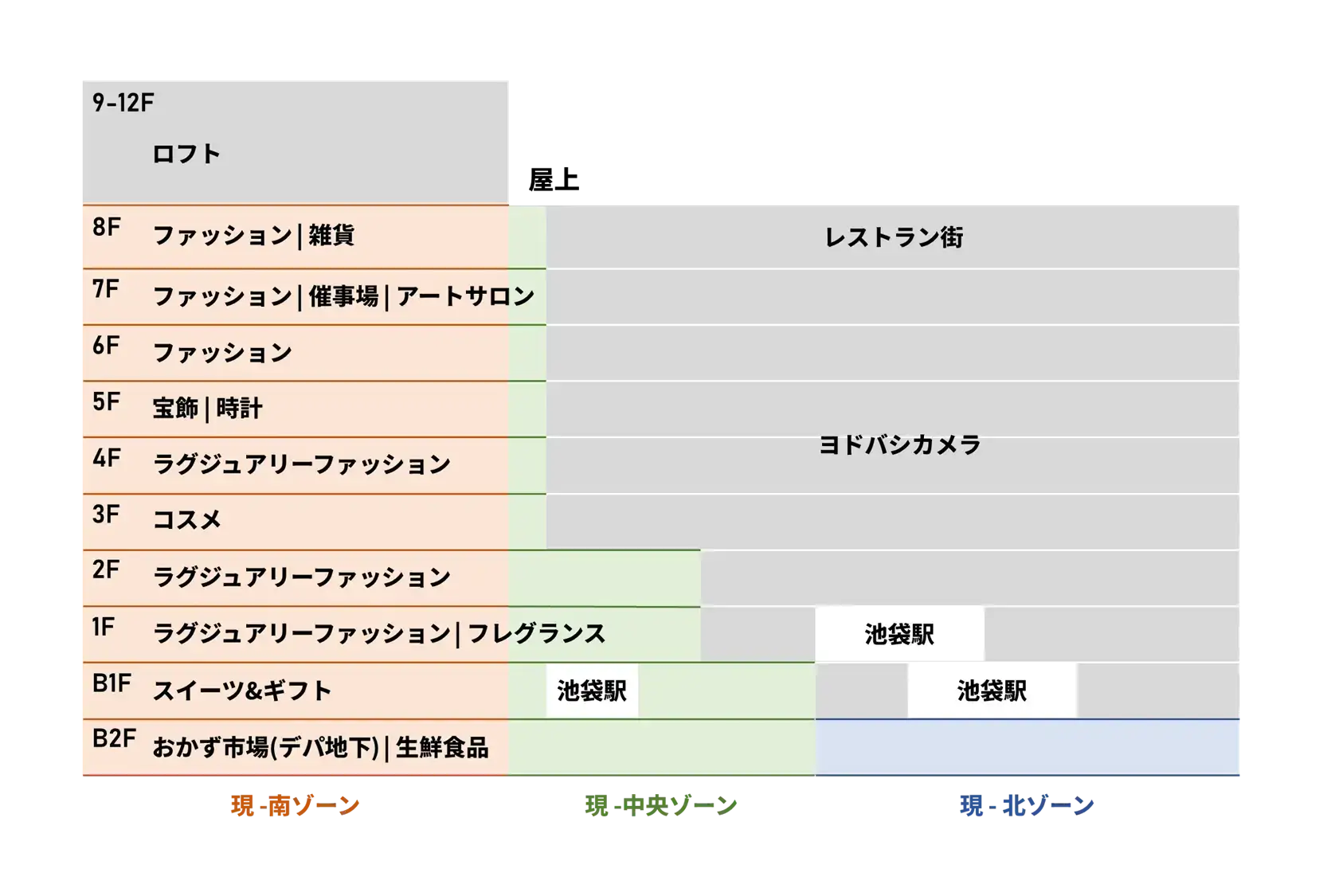 一方で、出店エリアについては少し誤りがあったかもしれません。具体的には地下1Fの出店エリアとして、南と中央ゾーンに池袋西武のデパ地下、北ゾーンにヨドバシカメラと推測していました。