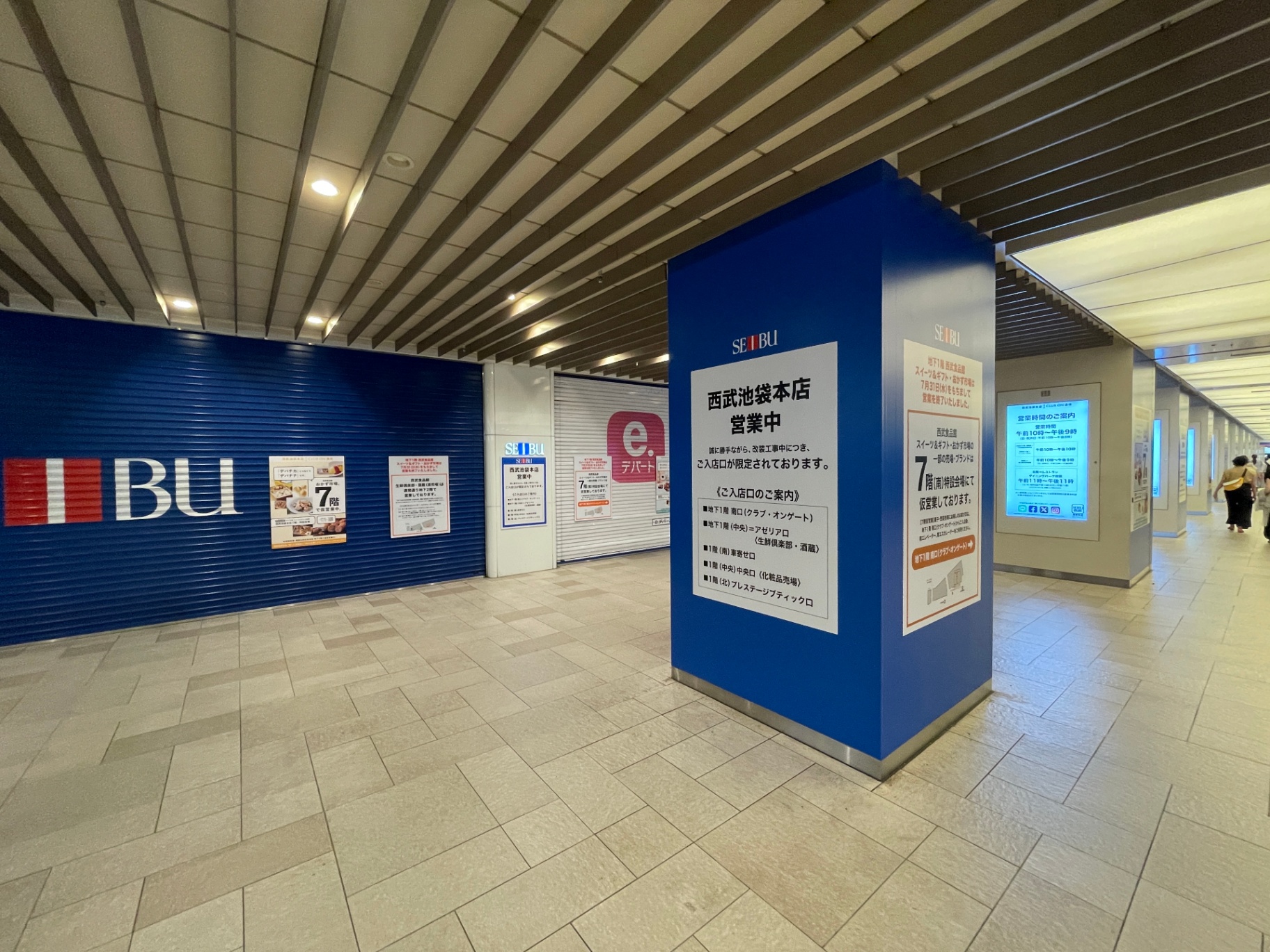 上層階のマップを見ても、北・中央ゾーンの多くには営業終了の文字、南ゾーンには主に改装工事中の文字があります。言葉の意味から察するに、閉鎖された区画の内、池袋西武のエリアとして再オープンする区画は「改装工事中」、ヨドバシカメラ(あるいは他のテナント)のエリアとなる部分が「営業終了」と表記されていることが推測できます。