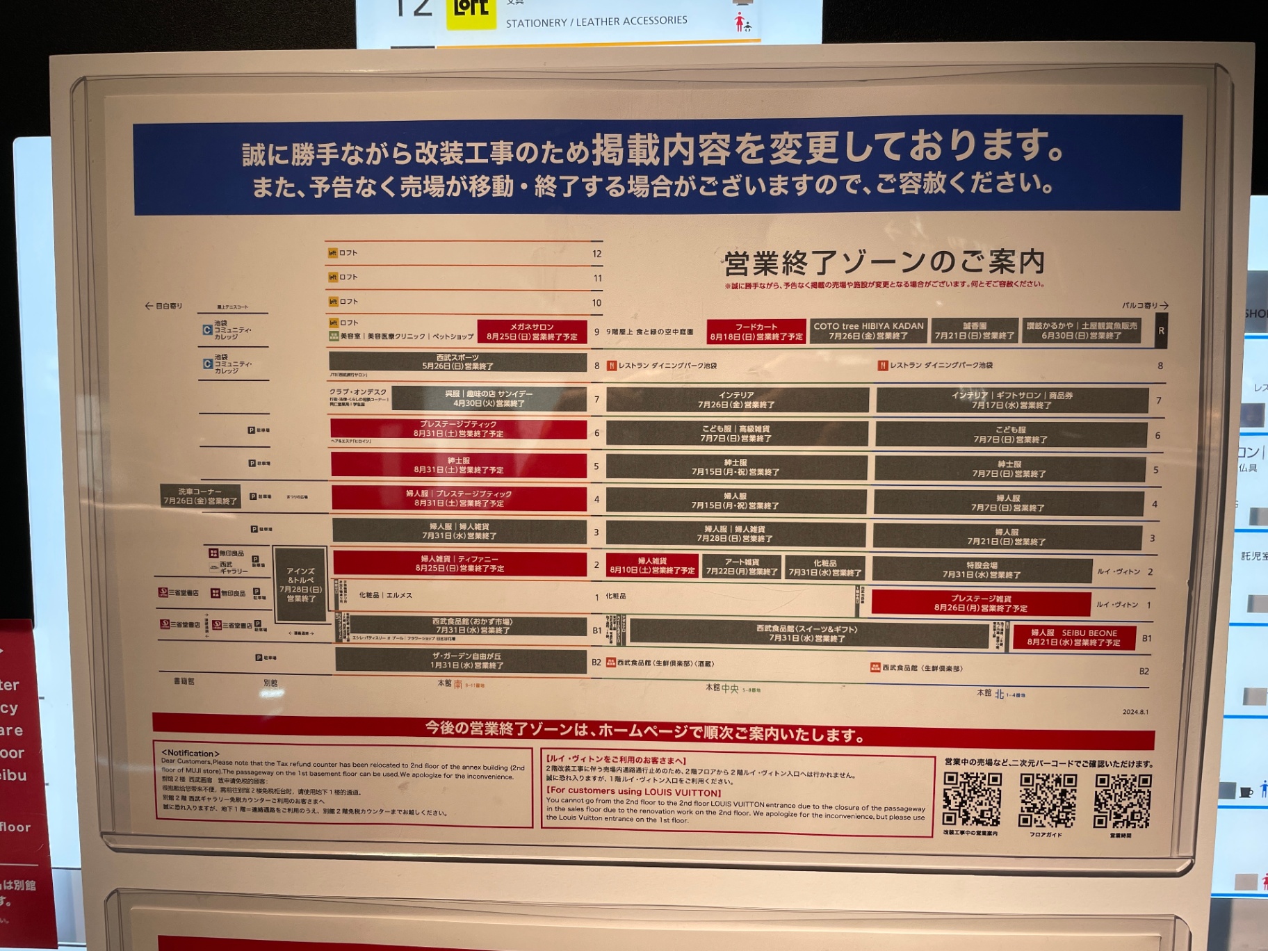 - ヨドバシへの引き渡しのための閉店は2024年8月までに行うといった一部情報があったものの、1Fはルイ・ヴィトン横の一部エリアを除いて営業終了予告がない