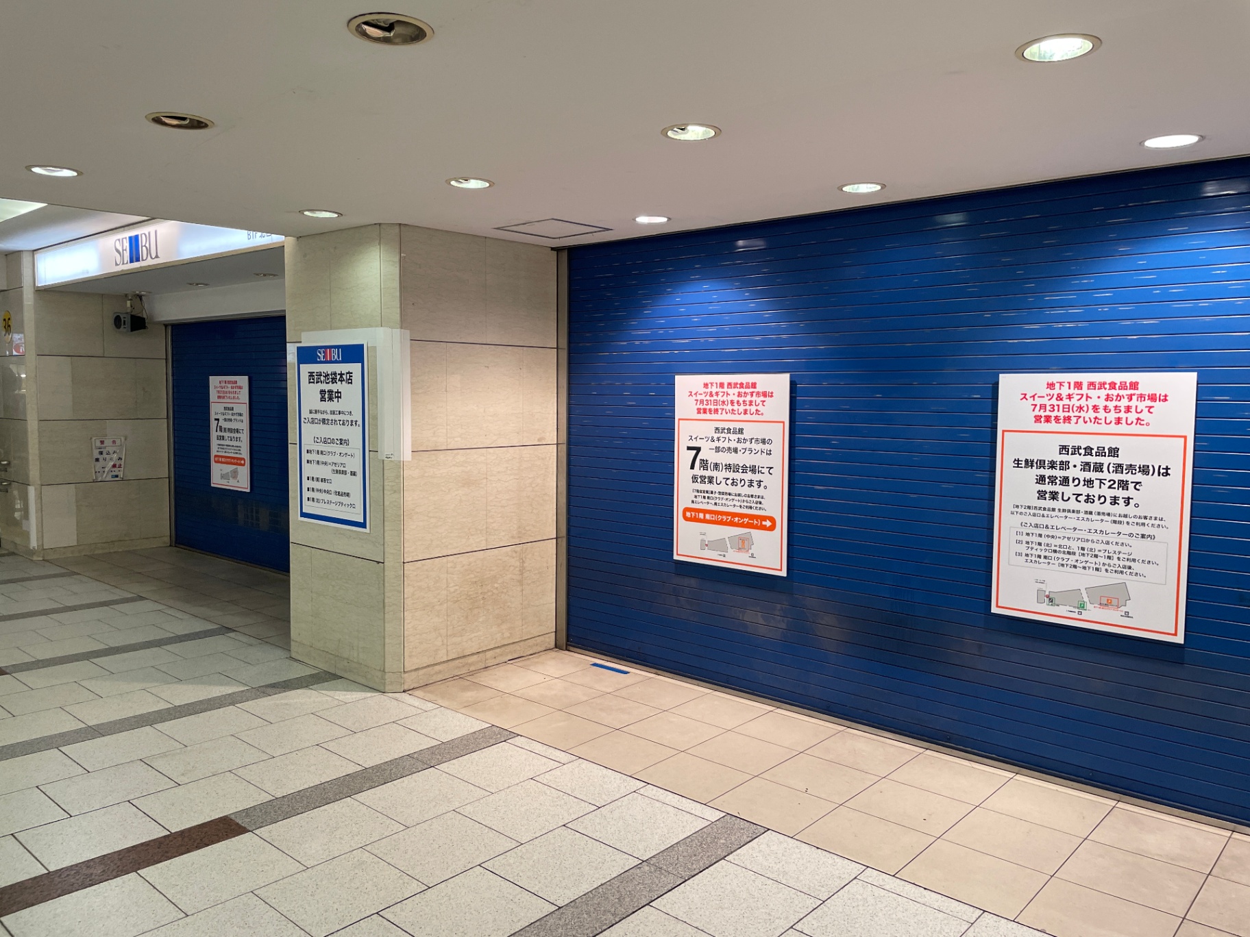 営業終了の翌日である、8月1日に行ってみると、これまでのデパ地下の入口の大部分はシャッターが閉まった状態で、上層階へのエレベータへのアクセスのために、一部のシャッターのみが開いている感じでした。
