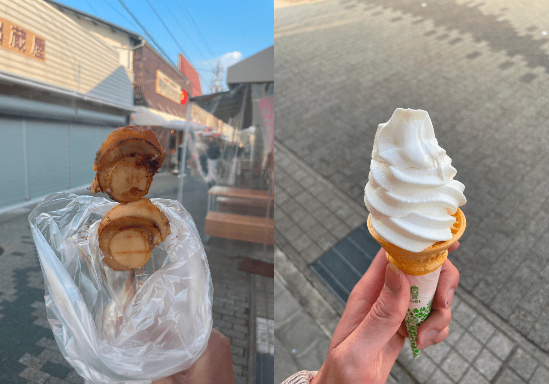 駐車場から東尋坊の間にたくさんの出店があり、ホタテ串とソフトクリームを食べました。ちなみにこの辺は鳶が多く人間の食べ物を狙っているようで...、目の前で襲撃されてる人を見かけました。屋根の下や建物のすぐ隣など安全な場所で食べましょう。