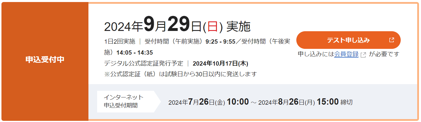 人間は「危機感」がないと努力できません(出典: 某メンズコーチ)。多分、だらだらと勉強しても一生受験の段階に進めない気がするので、先に受験日程を決めました。9月12日です。