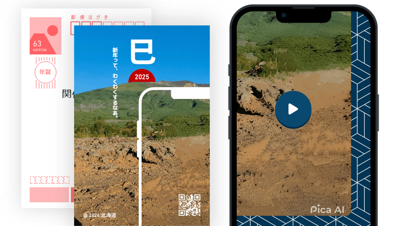 2024年に続いて、2025年の年賀状も紙で送った年賀状とサイト上のデジタル年賀状が合わさることで新たな体験ができることをコンセプトとしました。年賀状は紙媒体ですので、写真は印刷できますが、いうまでもなく動画は貼り付けられません。一方で、動画は画像に比べて多くの情報を持ち、一年を振り返る年賀状にはもってこいです。